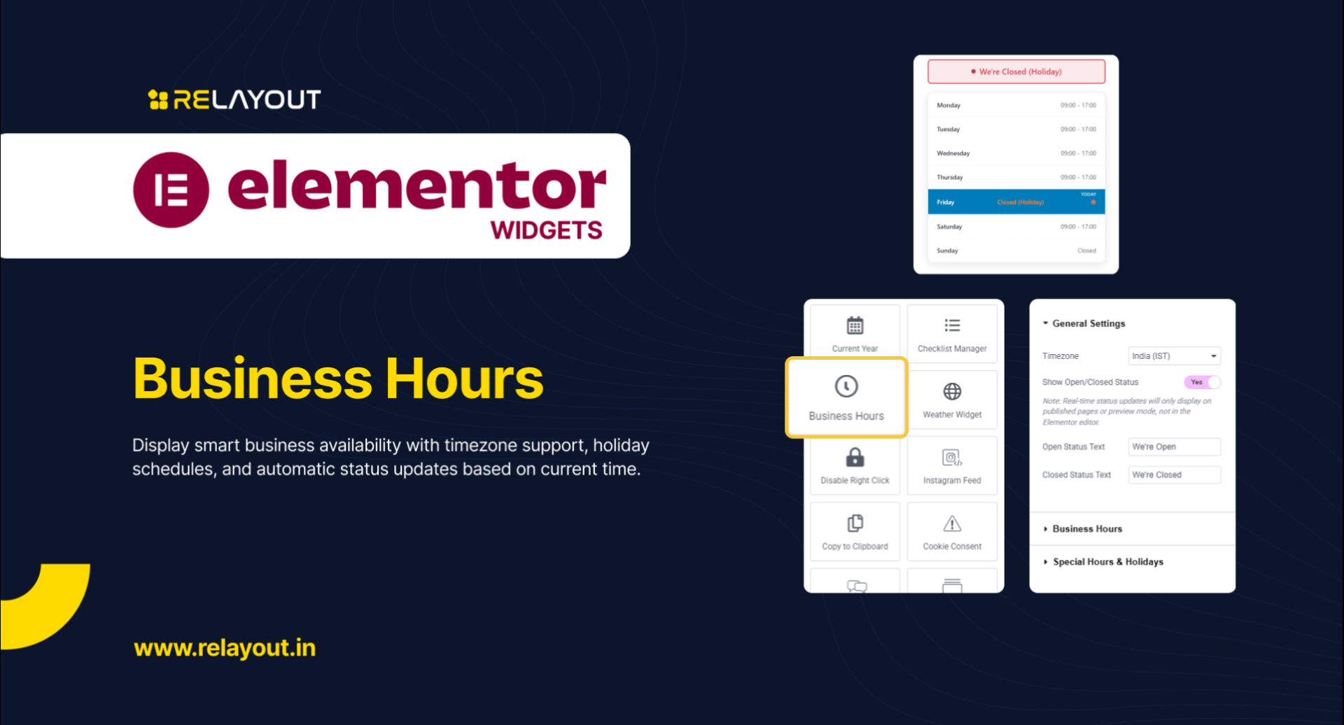 Display smart business availability with timezone support, holiday schedules, and automatic status updates based on current time.