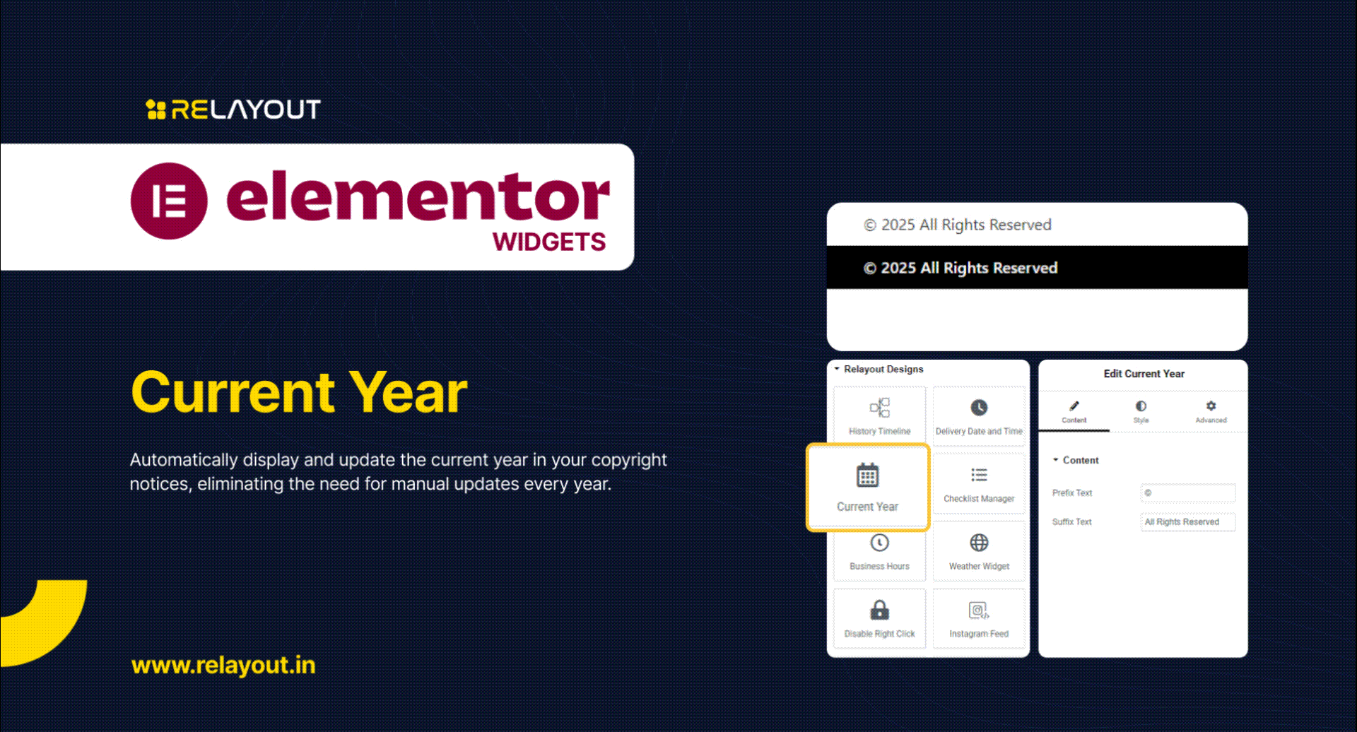 Never worry about outdated copyright dates again. This lightweight widget automatically displays the current year and updates seamlessly when the calendar changes. Essential for maintaining professional, up-to-date footer information across your entire website without any manual intervention.