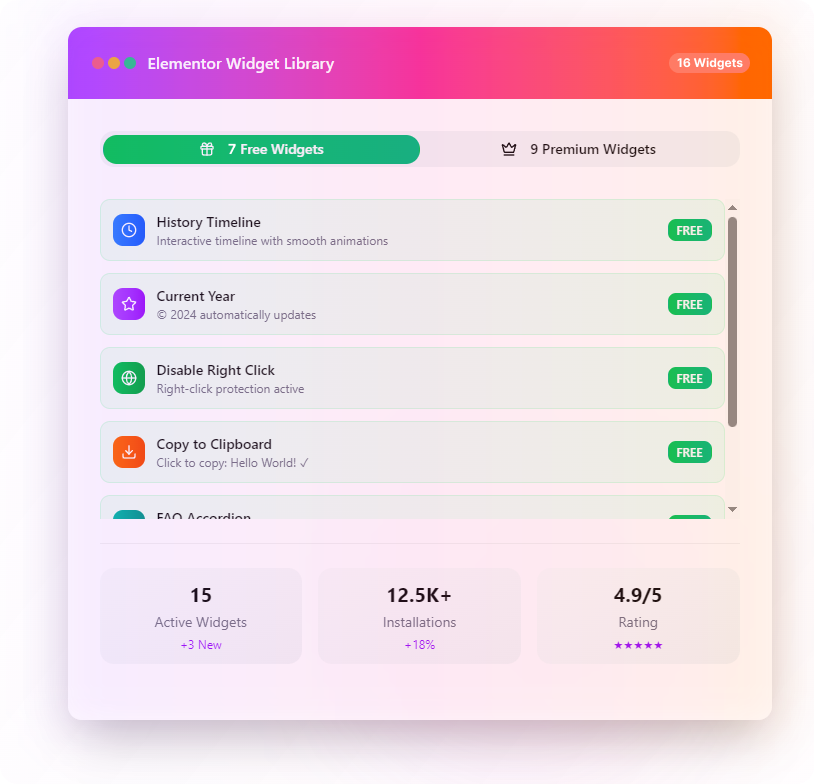 Supercharge your Elementor experience with 15 professional widgets designed to enhance functionality and boost user engagement. Perfect for designers, developers, and agencies.