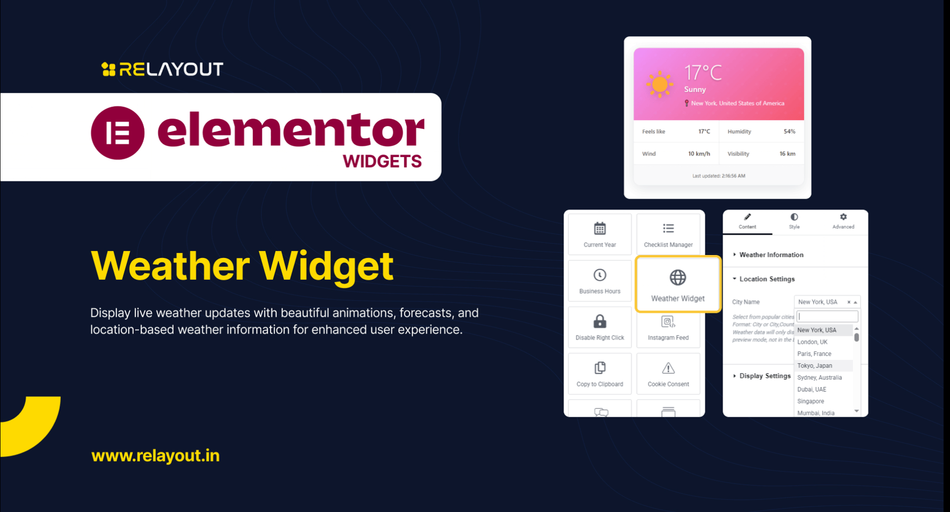 The Weather Widget delivers accurate, real-time weather updates with no API key required. Featuring over 100+ pre-configured cities worldwide, custom search, and multiple layout options, this widget is ideal for websites that want to provide local or global weather information seamlessly. With full styling customization, you can match the widget’s design to your brand while giving users valuable insights into temperature, humidity, wind speed, and conditions.